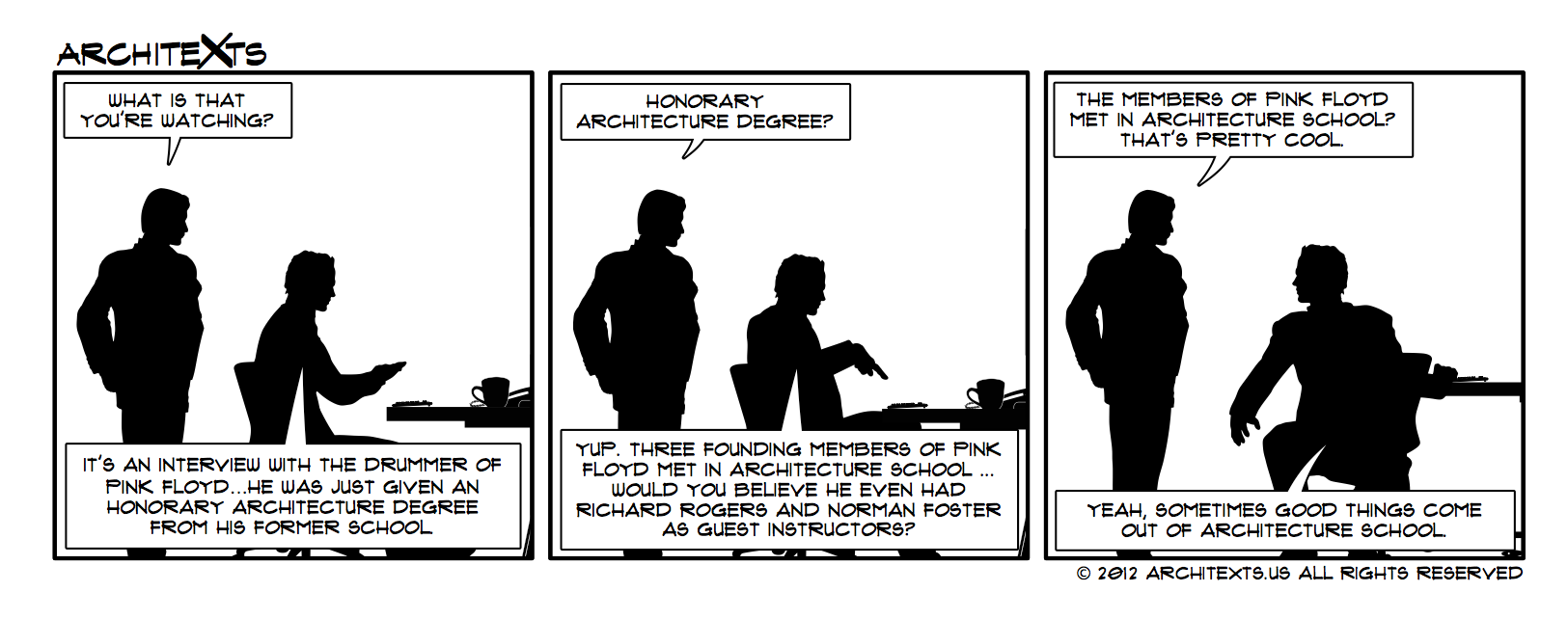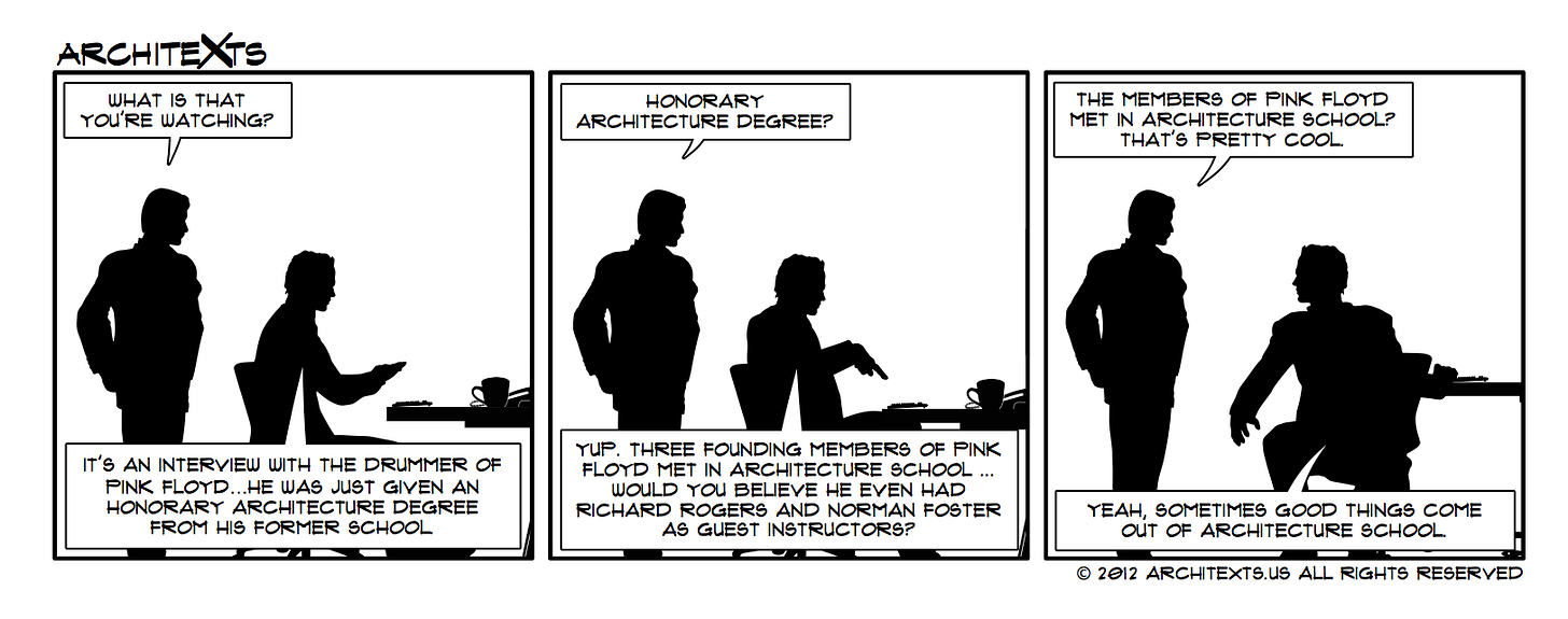 Check out this interview with Nick Mason of Pink Floyd — I’m sure everyone is glad they pursued their musical interests instead of architecture. –Maverick