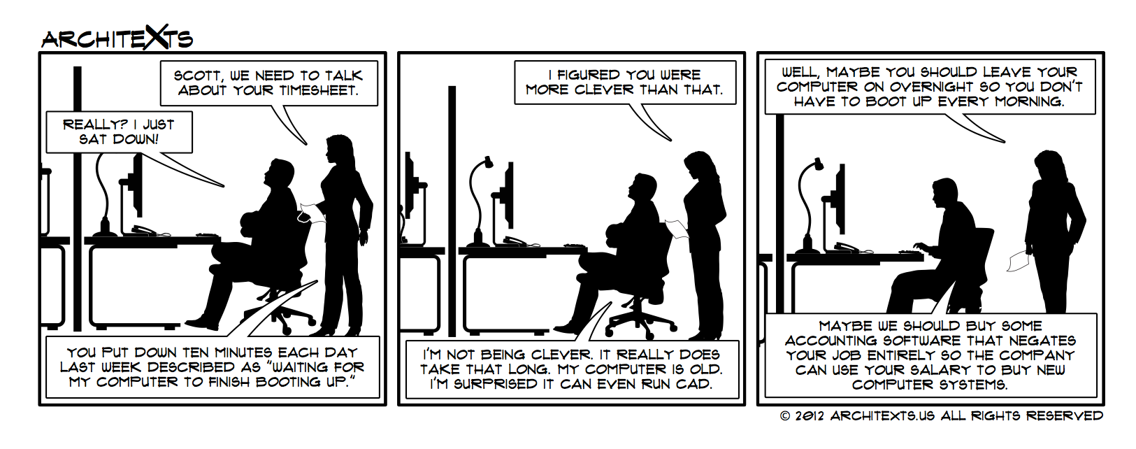 Booting UpModulor ManJan 30, 20251ShareThe computer I use at my office is really slow on boot up too. I’ve taken to leaving it on during the week because it’s so damn frustrating. –JokerThis comic was originally published on January 30th, 2012ShareSubscribe