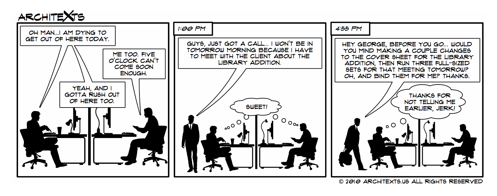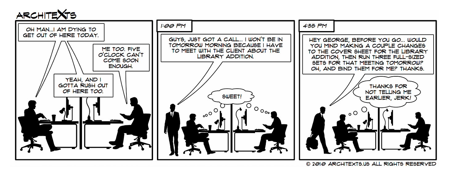 Don’t you hate it when your boss asks you in the final minutes of the day to do something. You just want to go home and you are suddenly expected to do a “quick” task. I was asked to print something minutes before the end of the day, and it took a lot longer than normal because I had to change the roll of paper in the plotter halfway through. –Joker