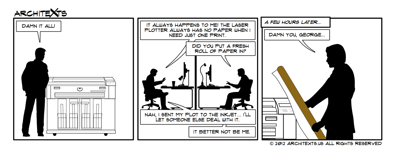 I recently left an empty roll of paper in the laser plotter because I didn’t want to change the roll for one simple plot. The next day when I saw someone else changing the roll, I couldn’t help but smile. –Maverick