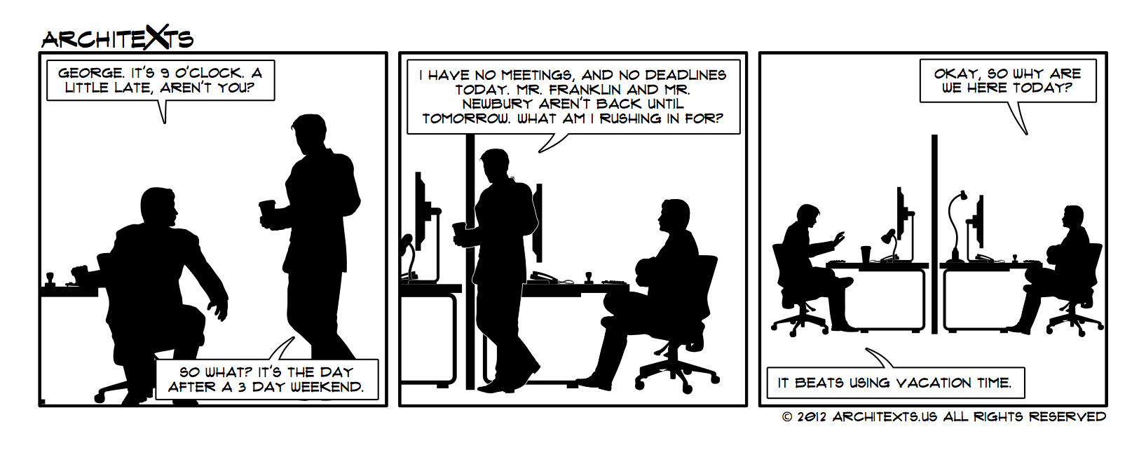 Why Are We Here Today?Modulor ManSep 04, 2025ShareIt’s those days when the bosses aren’t around that you don’t want to miss. –JokerThis comic was originally published on September 4th, 2012Architexts Archive Project is a reader-supported publication. To receive new posts and support my work, consider becoming a free or paid subscriber.Subscribe